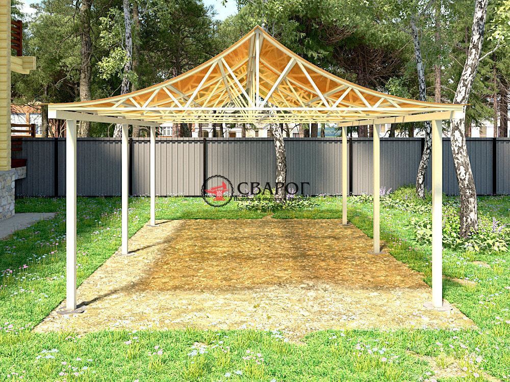 Размеры конструкции 3х6х3 м. Можно отдельно заказать перила. Используются профильные трубы, карбонат и кованые элементы.