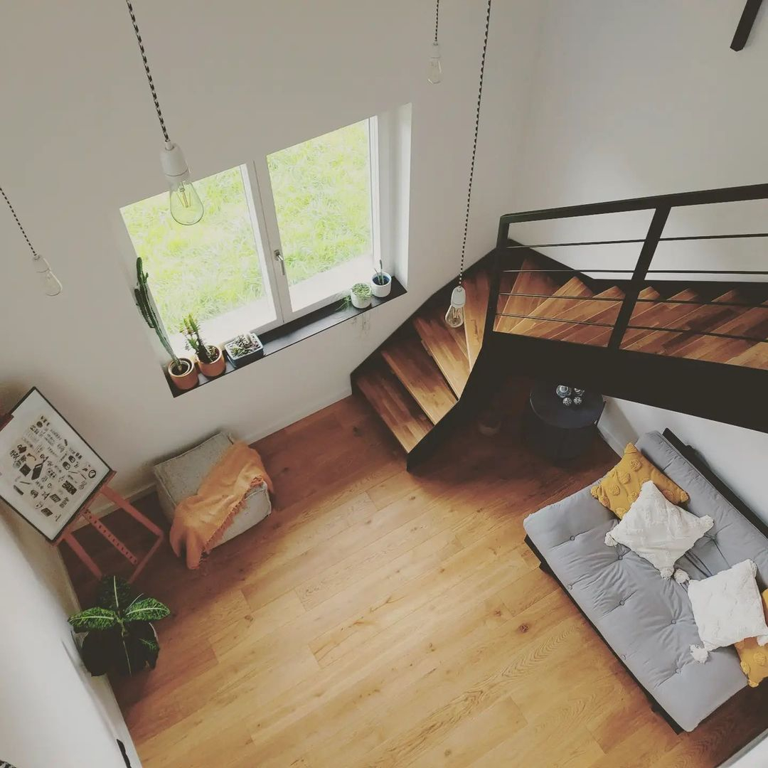 - Открытая лестница визуально расширяет пространство, делает его более светлым, а кроме того, она не затрудняет конвекцию воздуха.
