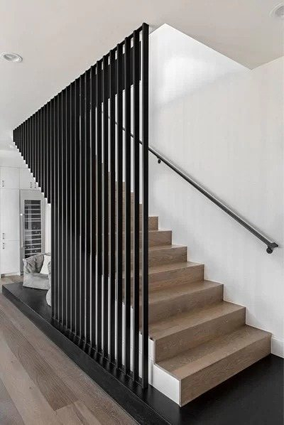 - Данный тип монтажа перил подразумевает крепление опорных стоек и балясин к торцу лестничного марша, таким образом, увеличивается полезная ширина пролета.