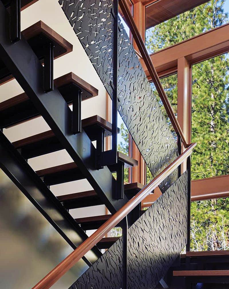 - Заполнение пространства между стойками ограждения вырезанным лазером металлическим листовым орнаментом способно придать помещению уникальный внешний вид.