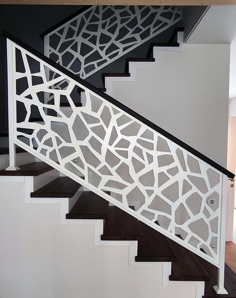 - Заполнение пространства между стойками ограждения вырезанным лазером металлическим листовым орнаментом способно придать помещению уникальный внешний вид.