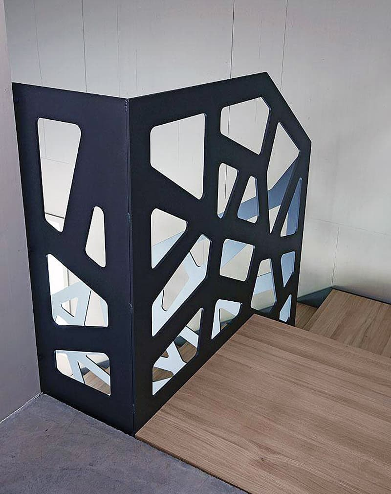 - Лазерная резка позволяет создать как украшенное композицией из сквозных отверстий сплошное полотно заполнения перил, так и легкую, ажурную конструкцию.