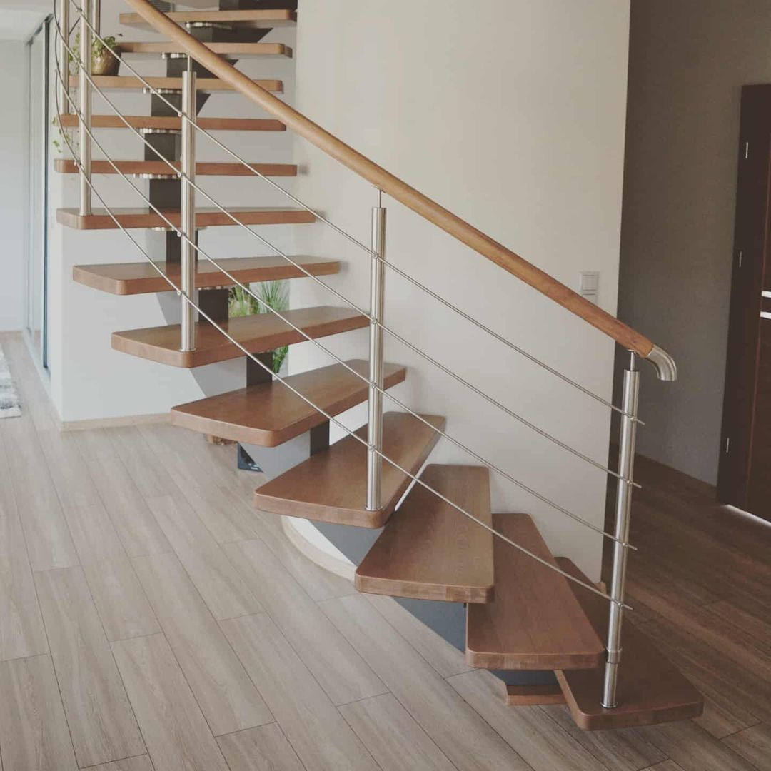 - Заполнение перил тросами (вантовое) – это креативное и нетривиальное решение задачи оригинальности лестничной конструкции, которое к тому же, сильно экономит деньги.