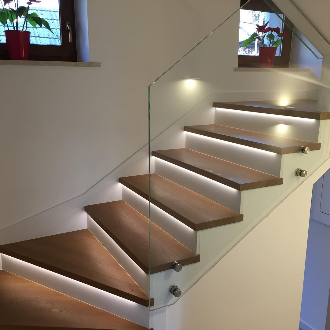 - Лестничные марши без перильных стоек, как правило, имеют весьма необычные ограждающие конструкции, благодаря чему помещение обретает стиль хай-тек.