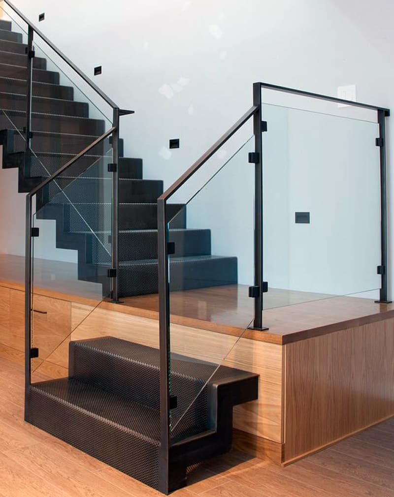 - Стеклянные перила прекрасно сочетаются с самыми разными материалами, делают пространство интерьера более открытым и оригинальным.