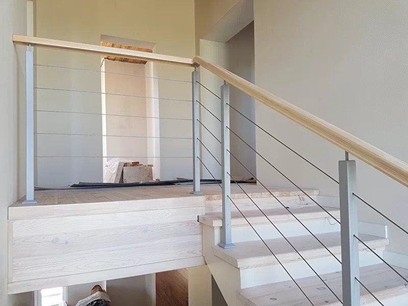 - Тросовые перила – это лестничные ограждения, где вместо горизонтальных перекладин используются тросы; такие перила привлекательны, но вместе с тем лаконичны.