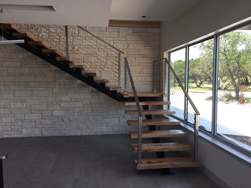 - Заполнение перил тросами (вантовое) – это креативное и нетривиальное решение задачи оригинальности лестничной конструкции, которое к тому же, сильно экономит деньги.